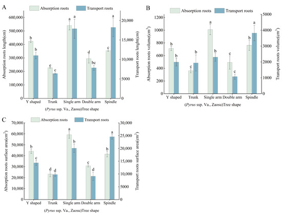 Root growth of different (Pyrus ssp. Va., Zaosu) tree shapes: (A) root length; (B) root volume; (C) root surface area. The data are presented as mean ± standard error of three biological replicates. Different lowercase letters indicate significant differences (p < 0.05).
