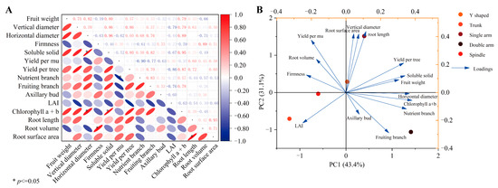 Pearson’s correlation analysis (A) and principal component analysis (B) of fruit quality, yield, and photosynthetic characteristics of different (Pyrus ssp. Va., Zaosu) tree shapes. Data are expressed as average values. * represent significant correlations at the p < 0.05 levels (two-tailed).
