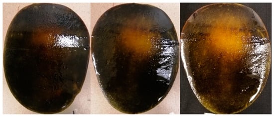 The starch iodine staining of fruit at different maturity after VHT showed that, in mature fruit, starch hydrolysis commenced in the inner mesocarp near the seed, where FCWP is typically observed (Figure 1). In less mature fruit, starch hydrolysis did not progress appreciably. Iodine staining confirmed that the white lesions within the mesocarp were starch (Figure 2). Thus, the hydrolysis of starch was disrupted by VHT.