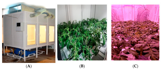Technology of growing ‘Vspyshka’ tomatoes in a low-volume climate chamber with an adjustable atmosphere. (A)—The appearance of the chamber; (B)—light of sodium lamps (LSL), the first chamber; (C)—LED radiation, the second chamber.