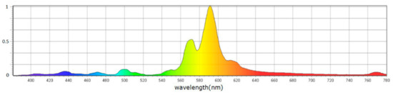 A high percentage of the blue spectrum in comparison with the red one can reduce the work of photosynthesis and stimulate the work of the antioxidant system of plants and protein biosynthesis [26]. The addition of a green spectrum (500–600 nm) improves the efficiency of the photosynthetic apparatus of the leaf, and the green spectrum affects the plant’s conducting system [27,28]. In addition to the above-mentioned lighting sources, orange light (590–620 nm) is often used, which also enhances the processes of photosynthesis and the movement of assimilates in the plant [28]. The combined use of green and orange lighting improves the water regime of plants and enhances growth processes due to the accumulation of photoassimilates in leaves [29].