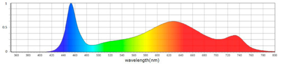 The spectral composition of LED lamps was chosen with a predominance of red (600–700 nm) spectral regions (Figure 3, Table 1), which corresponded to the absorption spectra of photosynthetic pigments of plants [14]. The luminaires consisted of four types of LEDs, namely white LEDs with a color temperature of 4000 K, blue LEDs (450 nm), far-red (730 nm), and red LEDs (630 nm), and formed LED blocks. To enhance photosynthesis processes according to the Emerson effect [43,44], far-red radiation was added with a share of 17% of the total PFD (Table 1).