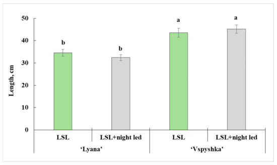 The effect of the spectral composition and duration of LSL and LSL+night LED illumination on the parameters of the length of shoots of tomato varieties (duration of LSL illumination 16 h; for LED—night lighting for 4 h). The data represent the average values of three repetitions (n = 10) ± Standard Error (S.E.). Letters above the columns are used to compare the length of shoots for each genotype. Different letters shown represent significant differences among the values according to Tukey’s HSD test (p < 0.05).