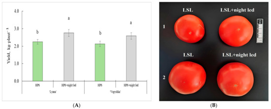 With LSL+night LED, there was a slight increase in yield for the studied varieties compared to plants grown under LSL illumination (Figure 5A). Figure 5B shows typical fruits of tomatoes grown under different lighting options. There were no significant differences in the effect of the white spectrum in the LED composition on the morphometric parameters of tomato fruits.