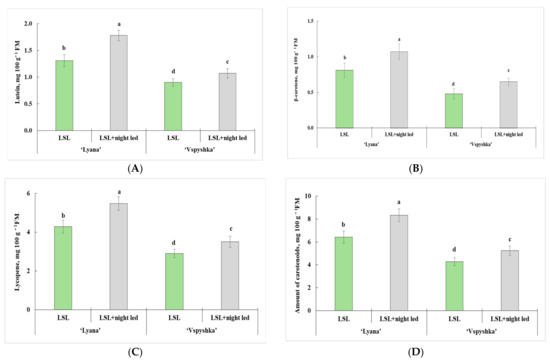 The effect of the spectral composition and duration of LSL and LSL+night LED illumination on the content of (A) lutein, (B) β-carotene, (C) lycopene, and (D) the amount of carotenoids in the fruits of tomato varieties. The data represent the average values of three repetitions (n = 10) ± Standard Error (S.E.). Letters above the columns are used to compare the biochemical components in fruits for each genotype. Different letters shown represent significant differences among the values according to Tukey’s HSD test (p < 0.05).