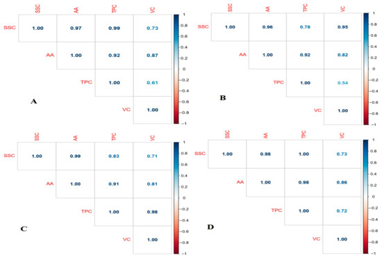 Correlations between the studied biochemical characteristics of ‘Lyana’ tomato fruits under the influence of LSL (A) and LSL+night LED (B) and of ‘Vspyshka’ tomato fruits under LSL (C) and LSL+night LED (D). The intensity of the color is proportional to the values of the correlation coefficient: light color means a weak or moderate relationship and dark blue color means a strong relationship.