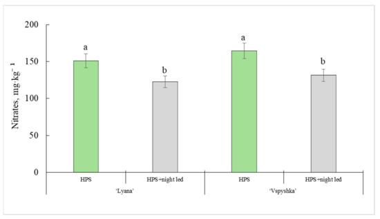 The correctly selected percentage ratio of blue, green, red, and far-red spectra of LED illumination (Table 1) reduced the concentration of nitrates in fruits (Figure 8). However, the total concentration of nitrates in the fruits of plants grown in two low-volume climatic chambers did not exceed the maximum permissible concentrations and did not pose a threat to human health.