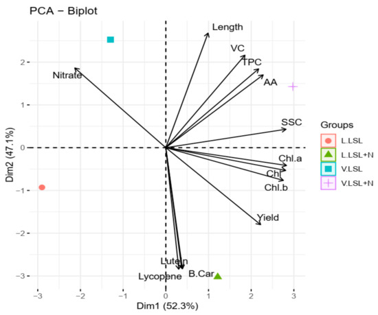 Due to the high correlation between the parameters measured in the study, a PCA analysis based on the correlation matrix was also performed (Figure 9). When the ratios of the eigenvalues explaining the total variance were examined, it was seen that the first dimension (principal component) alone explained 52.3% of the total variance, while the second dimension explained 47.1% of the total variance. The first two principal components together explained 99.4% of the total variance. The graphical representation of the results, as expected, showed that individuals formed distinct groups both in the comparison of the cultivars among themselves and in the different light treatments. In the context of the consistency of our results, the cultivars ‘Lyana’ and ‘Vspyshka’ exposed to LSL only are located on the left side of the graph, while the cultivars exposed to LSL+night LED are concentrated on the right side of the graph, together with all measurement parameters (except nitrate). The LSL+night LED-treated cultivar ‘Lyana’ was found to be superior in lutein, lycopene, and β-Carotene. On the other hand, ‘Vspyshka’ with LSL+night LED treatment was superior in terms of AA, TPC, and SSC. Other quality parameters varied among the varieties but increased with LSL+night LED treatment. The only parameter that did not increase with LSL+night LED treatment was nitrate treatment. This is one of the expected and important results of the study, which indicates that night LED treatment decreases nitrate accumulation.