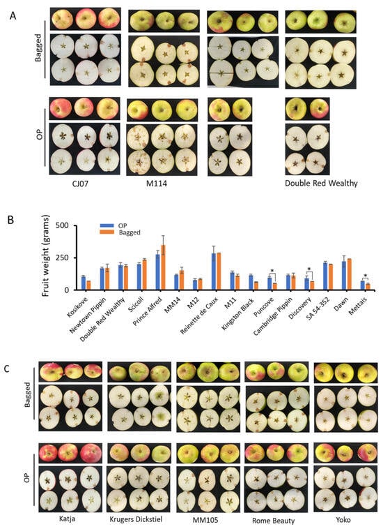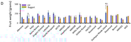 Phenotypic analysis of fruit derived from open-pollinated (OP) and bagged flowers of Malus domestica accessions. (A) Parthenocarpic accessions ‘CJ07’, ‘MM114’, ‘Prince Alfred’, and ‘Double Red Wealthy’. Seeds were found in the fruit derived from OP flowers (bottom panel) but not found in fruit derived from bagged flowers (upper panel). (B) The graph shows the average fruit weight of those derived from OP and bagged flowers of 22 parthenocarpic accessions. (C) Photographs show whole and cut fruit of five self-compatible accessions ‘Katja’, ‘Krugers Dickstiel’, ‘MM105’, ‘Rome Beauty’, and ‘Yoko’. Seeds were found in the fruit derived from both OP (bottom panel) and bagged flowers (upper panel). (D) The graph shows average fruit weight of those derived from OP and bagged flowers of 26 self-compatible accessions. The error bars present SE of three fruits for OP accessions, and variable fruits for bagged accessions. Asterisks indicate significant differences between bagged and OP fruits (*, p < 0.05; **, p < 0.01, Student’s test).