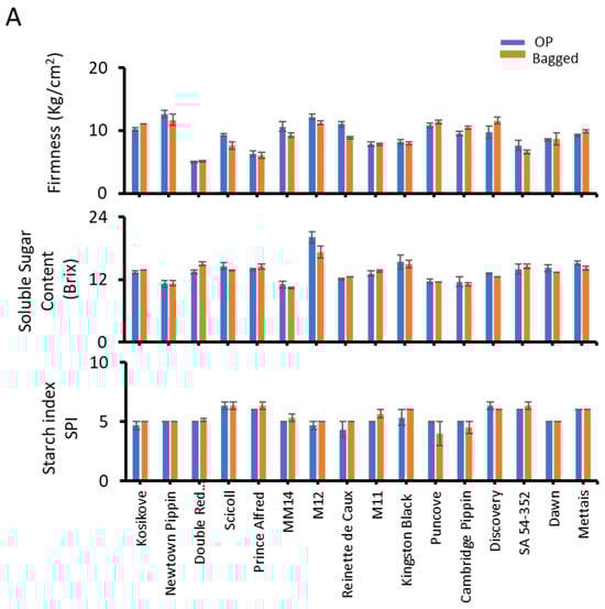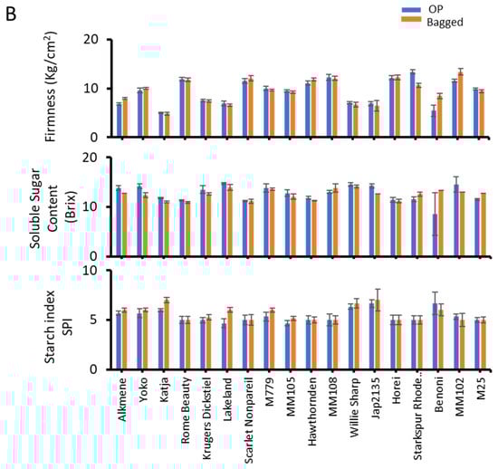 Comparison of quality traits between fruits derived from open-pollinated (OP) and bagged flowers. (A) Fruit firmness, soluble sugar content and starch index were measured for 16 parthenocarpy accessions. (B) Fruit firmness, soluble sugar content and starch index were measured for 18 self-compatible accessions. Starch pattern index was visually match to the standard ground colour chart (ENZA International, New Zealand). The error bars present SE of three fruits for OP accessions, and variable fruits for bagged accessions.