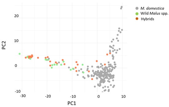 Population structure was investigated using the principal component analysis (PCA) of SNP genotypes of all accessions. The principal components were then used as covariates in the MLM to minimise spurious marker–trait associations. The results showed that the accessions grouped according to known genetic relationships (Figure 4). M. domestica accessions mostly formed one cluster separate from Malus species, while the hybrid group (Aotea hybrids) spread between M. domestica and wild Malus spp.