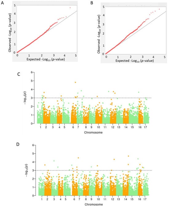 Genome-wide association study (GWAS) analysis for parthenocarpy and self-compatibility. (A,B) The quantile–quantile (Q–Q) plots of parthenocarpy trait (A) and self-compatible trait (B). The red line indicates the observed p < 0.001 threshold and the black line indicates the expected threshold. (C,D) The Manhattan plot shows the level of significance for SNPs correlated with parthenocarpy trait (C) and self-compatible (D) trait from the GWAS analysis (numbers across the x-axis indicate the chromosome). The black dashed lines represent the threshold −log10(p) ≥ 3.0.