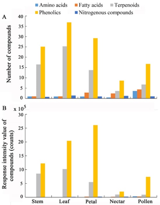 The numbers of chemical substances tentatively identified in leaves (138) and petals (98) were higher than those in pollen (79), stems (78) and nectar (49). The stems, leaves, petals, pollen and nectar of these nine Ericaceae species were all richer and more abundant in terpenoids and phenolics (Figure 4A,B). For stems, the value of response intensity of phenolics (1.22 × 106 counts) and terpenoids (8.55 × 105 counts) were higher than that of fatty acid (2.85 × 103 counts), nitrogenous compounds (2.23 × 103 counts) and animo acid (1.87 × 103 counts). For leaves, the value of response intensity of phenolics (2.04 × 106 counts) and terpenoids (1.02 × 106 counts) were higher than that of nitrogenous compounds (1.41 × 104 counts), fatty acid (4.75 × 103 counts) and animo acid (1.52 × 103 counts). For petals, the value of response intensity of phenolics (2.61 × 106 counts) and terpenoids (5.49 × 105 counts) were higher than that of nitrogenous compounds (2.05 × 104 counts), fatty acid (2.12 × 104 counts) and animo acid (4.32 × 103 counts). For nectar, the value of response intensity of phenolics (2.03 × 105 counts) and terpenoids (9.90 × 104 counts) were higher than that of nitrogenous compounds (2.08 × 104 counts), fatty acid (1.80 × 104 counts) and animo acid (2.23 × 103 counts). For pollen, the value of response intensity of phenolics (7.37 × 105 counts) and terpenoids (9.20 × 104 counts) were higher than that of animo acid (3.29 × 104 counts), fatty acid (2.52 × 104 counts) and nitrogenous compounds (3.93 × 103 counts) (Figure 4B).