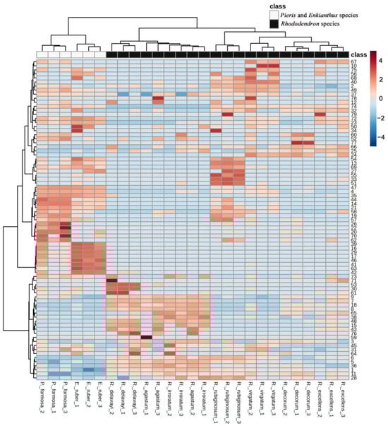 Heat map cluster analysis of chemical value of response intensity in pollen 496 of Enkianthus ruber and Pieris formosa (in open bar); Rhododendron species (R. agastum, R. delavayi, R. decorum, R. irroratum, R. excellens, R. virgatum, R. rubiginosum, in black) after UPLC-Qtof-MS analysis. For the heat map cluster analysis, high and low abundance are indicated by red and blue colors. The numbers 1–79 represent chemical names, which are shown in Table 2.