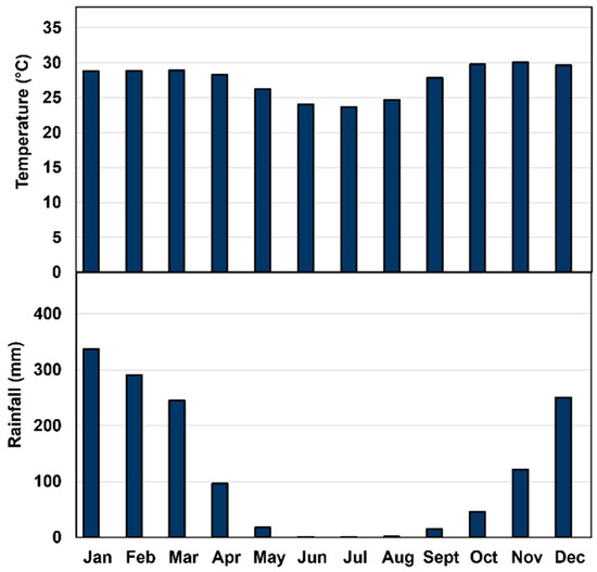 Average monthly temperature and rainfall at Coastal Plains Research Farm, NT [18].