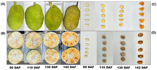 Changes in size and colour of fruit (A) bulb (B) transverse section of fruit (C) and seeds (D) during fruit maturation and ripening of jackfruit ‘Accession 341’.