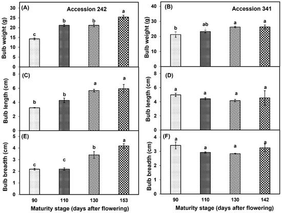 Changes in bulb weight (A,B), bulb length (C,D) and bulb breadth (E,F) during fruit maturation and ripening of jackfruit ‘Accession 242’ and ‘Accession 341’. Vertical bars show the standard deviation of means (n = 3). Means with the same letters represent non−significant differences by LSD test (p > 0.05).