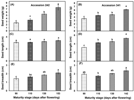 Changes in seed weight (A,B), seed length (C,D) and seed breadth (E,F) with fruit maturation and ripening of jackfruit ‘Accession 242’ and ‘Accession 341’. Vertical bars show the standard deviation of means (n = 3). Means with the same letters represent non−significant differences by LSD test (p > 0.05). Seed weight, length and breadth were recorded on 10 seeds per replication and then averaged for each replication (n = 3).