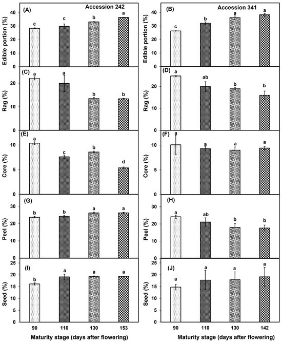 Changes in edible portion (A,B), rag percentage (C,D), core percentage (E,F), peel percentage (G,H) and seed percentage (I,J) during fruit maturation and ripening of jackfruit ‘Accession 242’ and ‘Accession 341’. Vertical bars show the standard deviation of means (n = 3). Means with the same letters represent non−significant differences by LSD test (p > 0.05).