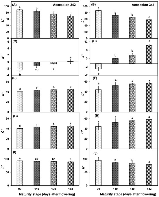 Changes in bulb chromaticity values L* (A,B), a* (C,D), b* (E,F), C* (G,H), and h° (I,J) during maturation and ripening of jackfruit ‘Accession 242’ and ‘Accession 341’. Vertical bars show the standard deviation of means (n = 3). Means with the same letters represent non-significant differences by LSD test (p > 0.05). Bulb colour was recorded on three bulbs per replication and then the average was calculated for each replication (n = 3). L* = lightness; a* = ranging from green [-] to red [+]; b* = ranging from blue [-] to yellow [+]; C* = chroma; h° = hue angle.