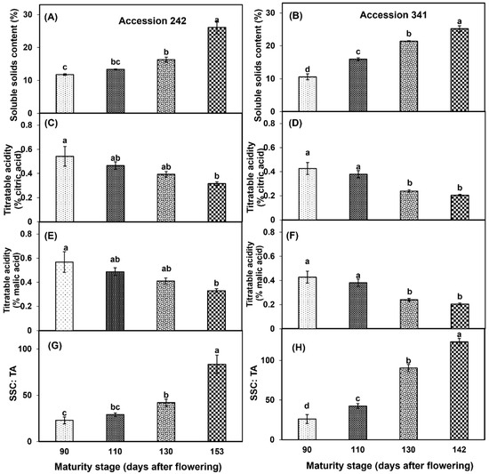 Changes in soluble solids content (A,B), titratable acidity (C–F) and SCC: TA (G,H) during fruit maturation and ripening of jackfruit ‘Accession 242’ and ‘Accession 341’. Vertical bars show the standard deviation of means (n = 3). Means with the same letters represent non-significant differences by LSD test (p > 0.05).