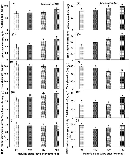 Changes in the levels of ascorbic acid (A,B), total carotenoids (C,D), total phenolics (E,F), total flavonoids (G,H) and DPPH radical scavenging activity (I,J) during maturation and ripening of jackfruit ‘Accession 242’ and ‘Accession 341’. Vertical bars show the standard deviation of means (n = 3). Means with the same letters represent non−significant differences by LSD test (p > 0.05).