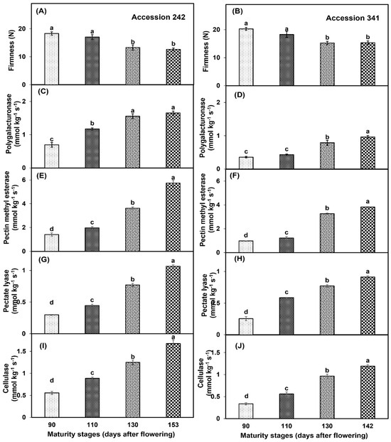 Changes in bulb firmness (A,B), activities of polygalacturonase (C,D), pectin methyl esterase (E,F), pectate lyase (G,H) and cellulase (I,J) during maturation and ripening of jackfruit ‘Accession 242’ and ‘Accession 341’. Vertical bars show the standard deviation of means (n = 3). Means with the same letters represent non−significant differences by LSD test (p > 0.05). Bulb firmness was recorded on three bulbs per replication and then averaged for each replication (n = 3).