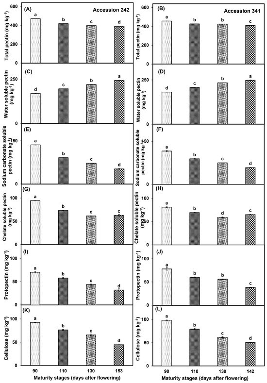 Changes in the levels of total pectin (A,B), water−soluble pectin (C,D), sodium carbonate soluble pectin (E,F), chelate soluble pectin (G,H), protopectin (I,J) and cellulose (K,L) during maturation and ripening of jackfruit ‘Accession 242’ and ‘Accession 341’. Vertical bars show the standard deviation of means (n = 3). Means with the same letters represent non−significant differences by LSD test (p > 0.05).