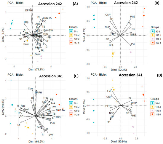 Principal component biplots displaying the correlation between fruit physical attributes, biochemical parameters, antioxidants, activities of fruit softening enzymes and cell wall polysaccharides in bulbs during different stages of fruit maturation and ripening of jackfruit ‘Accession 242’ (A,B) and ‘Accession 341’ (C,D).