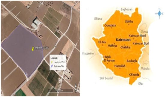 The representative site of Baten is located at 35°42′53.00″ N, 10°02′12.20″ E in the Kairouan region. This irrigated area covers 20 ha (Figure 1). The climate is semi-arid. The mean annual precipitation over the Kairouan region is closed to 300 mm, with high annual variability. The average annual maximum and minimum temperature are 14.5 °C and 38.1 °C, respectively, and the average relative humidity is nearly 74.3%. In this region, the main cereals and vegetables are winter wheat and late season tomato. The groundwater is the main water supply source, and over 70% of this source is used for irrigation. In this study, an industrial tomato variety (Solanum lycopersicum L. Var. Savera) was assessed for three years (2019–2022) during the period between February and July. During the assessment, N-fertilizer rates varied from 200 to 230 kg ha−1.