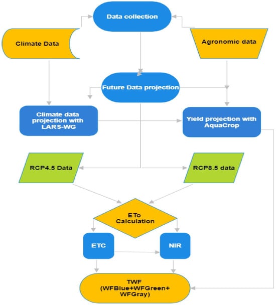 The current study evaluates the change in water footprint of industrial tomatoes irrigated with saline water for the period between 2023 and 2050 under two scenarios of climate change. During this period, changes in irrigation requirements considering the leaching requirement (LR), precipitation, and yield are the major factors affecting the components (blue, green, and gray WF), as well as the total water footprint. Therefore, the research process was developed based on successive steps (Figure 2):
