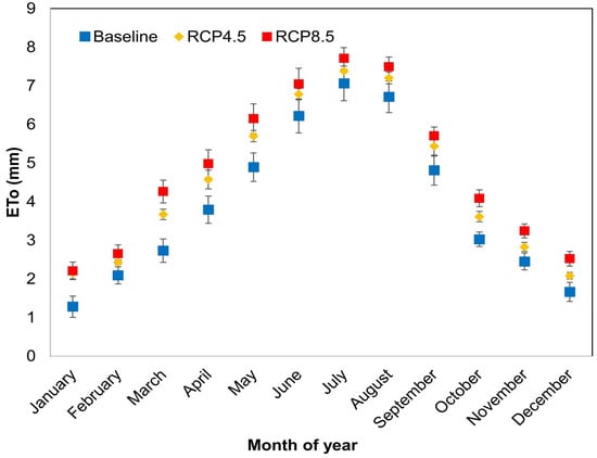 Monthly ETo evolution under the RCP4.5 and RCP8.5 scenarios compared with the baseline period. Average monthly ETo ± standard deviation.