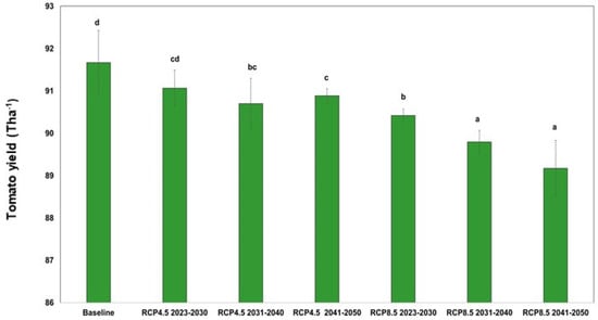 The estimation of tomato yield was carried out using the Aqua Crop model (version 7.1, 2023), as described in the manual of the Food and Agriculture Organization of the United Nations [46]. The model had been calibrated using the collected data from the field experiment during the three cropping seasons 2019–2022. After calibration, the model was run for the simulation of tomato yield evolution during the period 2023–2050 under RCP4.5 and RCP8.5 scenarios compared to the baseline period. The conformity between the predicted and observed values was assessed by using the coefficient of determination (R2), the root mean square error (RMSE), and the Nash–Sutcliffe coefficient.