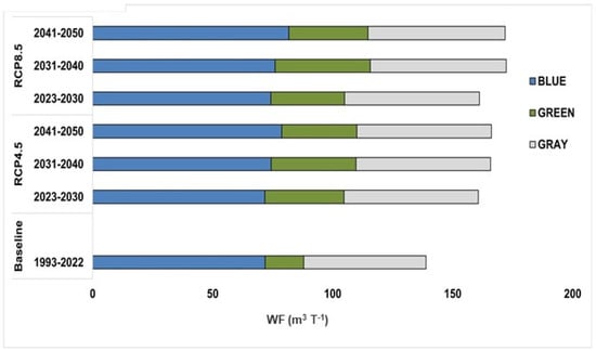The concept of the water footprint (WF) has not adequately explored the combined effects of climate change and salinity. For this aim, the effects of future climate conditions on tomato WF irrigated with moderately saline water (EC = 2.9 dS m−1) were examined, considering an expected increase in salinity reaching 5.9 dS m−1 by 2050. Reference evapotranspiration (ETo), effective rainfall (ER), tomato crop evapotranspiration (ETc), leaching requirement (LR), net irrigation requirement (NIR), and tomato yield were estimated using CropWat and AquaCrop models. The blue (WFBlue), green (WFGreen), gray (WFGray), and total WF (TWF) were calculated. Results showed that ETo, ETc, and ER are expected to increase, while tomato yields will show a slight decrease. NIR is expected to increase depending on climate change scenarios and the increasing salinity of water irrigation. Calculated WF components showed significant increases, which consequently led to an increase in WFT exceeding the Tunisian national and regional levels by 15% and 18% between 2023 and 2050 under two scenarios, RCP4.5 and RCP8.5. The results highlighted the importance of WF for developing adaptation strategies to manage limited water resources, while advanced research on a large scale based on smart assessment tools is required to find best practices for water use reduction.