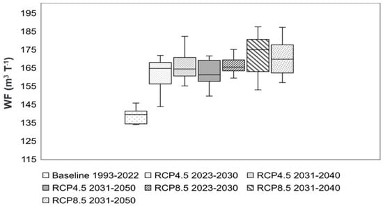 ETc was estimated, based on the estimated ETo, for three periods (2023–2030, 2031–2040, and 2041–2050) and under RCP4.5 and RCP8.5 scenarios in comparison with the baseline. The results of ETc are given in Table 2. The average values showed significant increases (p < 0.05) under both RCP4.5 and RCP8.5 scenarios. The results under the RCP8.5 scenario showed that ETc had the highest values compared to the baseline in the period 2041–2050. However, the minimum ETc change was obtained in the period 2023–2030 under the RCP4.5 scenario.
