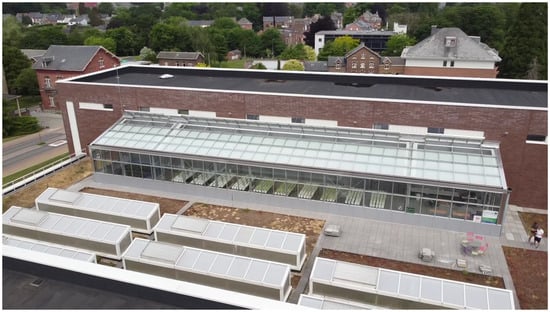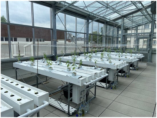 The experimental trial was carried out at the “SERR’URE” rooftop half-chapel bioclimatic greenhouse on the TERRA building from the University of Liège–Gembloux Agro-Bio Tech located in Gembloux (Walloon Region, Belgium; lat. 50.562643° N, long. 4.697433° E; alt. 166 m above sea level). The greenhouse has an area of 198 m2 and is divided into three compartments dedicated to research, teaching, and demonstration (Figure 1). The trial was conducted in the research compartment (132 m2) consisting of measurements 5.5 m wide, 24 m long, and 4.2 and 5.6 m high at the eaves and ridge, respectively, from 29 April 2022 to 19 August (Santhica 27) and 31 August (Félina 32) 2022. Fourteen days after sowing in rockwooll, the seedlings were transplanted into hydroponic Nutrient Film Technique Goponic® gutters (Agri Logic System, Normandie, New Caledonia, France) (Figure 2). The nutrient film technique (NFT) involves exposing plant roots to a thin layer of nutrient-enriched water flowing through horizontal gutters, installed with a slope of 1–2% to ensure proper water flow. By keeping the stream shallow, the roots benefit from an increased air exchange surface. This method promotes optimal oxygen availability to the roots, ultimately supporting higher vegetable yields [].