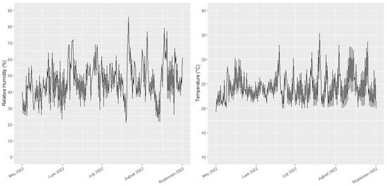 The greenhouse climatic conditions (relative humidity (%) and temperature (°C)) throughout the experimental period.