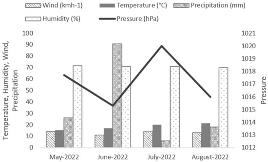 The field growing conditions (total precipitations and mean (wind, temperature, humidity, and pressure) per month) throughout the experimental period. The left vertical axis presents the total precipitation per month and temperature, wind, and humidity mean values and the right vertical axis presents the air pressure mean.