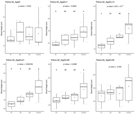 Boxplot of Félina 32 shoot height the day (AppD) and after the application day (AppD+) of the ethylene treatment. D1: 30 µL L−1 ethylene dose; D2: 15 µL L−1 ethylene dose; D3: 7.5 µL L−1 ethylene dose; Control: without ethylene treatment. Mean values are red colored. Student’s comparisons were applied with 95% confidence; groups that do not share a letter are significantly different.