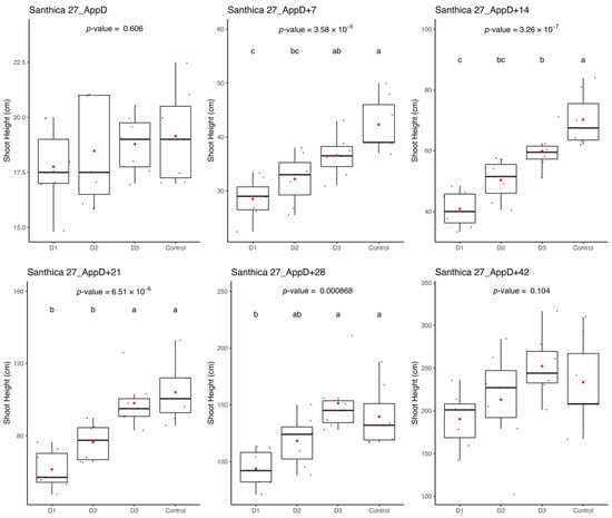 Boxplot of Santhica 27 shoot height the day (AppD) and after the application day (AppD+) of the ethylene treatment. D1: 30 µL L−1 ethylene dose; D2: 15 µL L−1 ethylene dose; D3: 7.5 µL L−1 ethylene dose; Control: without ethylene treatment. Mean values are red colored. Student’s comparisons were applied with 95% confidence; groups that do not share a letter are significantly different.
