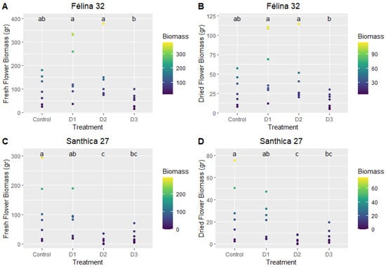 The impact of the different doses of ethephon on the fresh and dried flowers biomass. The values are individual plant biomass (n = 7 per treatment). Dots are colored in function of their value. (A,B) represents, respectively, the fresh and dried biomass of Félina 32; (C,D) represents, respectively, the fresh and dried biomass of Santhica 27. Ethephon treatment: Control: 0 µL L−1; D1: 30 µL L−1; D2: 15 µL L−1; and D3: 7.5 µL L−1. Letters above the columns represent Student’s comparisons applied with 95% confidence; groups that do not share a letter are significantly different.