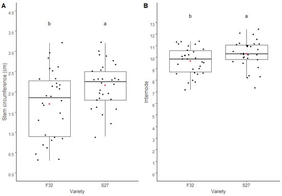 Boxplot of stem circumference (A) and internode (B) of the cultivar Santhica 27 and Félina 32 (F32: Félina 32; S27: Santhica 27). Student’s comparisons were applied with 95% confidence; groups that do not share a letter are significantly different. Mean values are red colored.