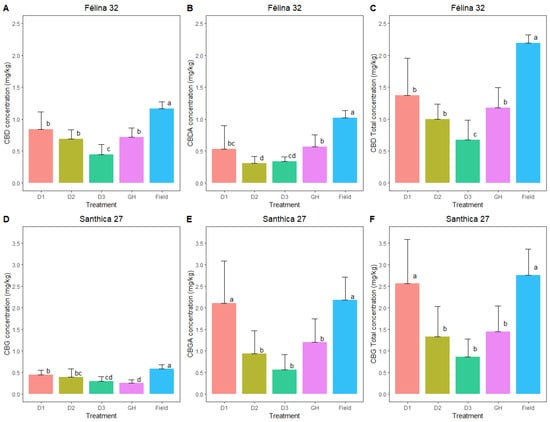 Impact of ethephon treatment on the dominant cannabinoid concentration at full maturity. Values are means ± SD (n = 7 in the greenhouse; n = 6 in the field). (A–C) are the various forms of cannabidiol in Félina 32; (D–F) are the various forms of cannabigerol in Santhica 27. D1: 30 µL L−1 ethylene dose; D2: 15 µL L−1 ethylene dose; D3: 7.5 µL L−1 ethylene dose; GH: greenhouse without ethylene dose. Student’s comparisons were applied with 95% confidence; groups that do not share a letter are significantly different.
