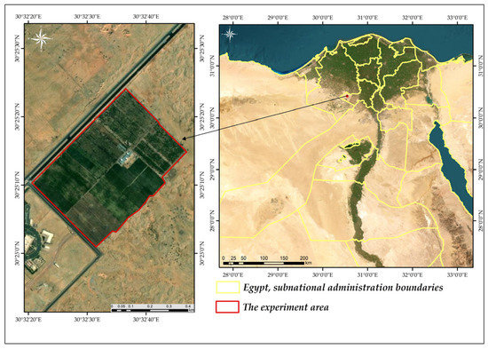Field trials were carried out at the Faculty of Agriculture farm, Al-Azhar University at Sadat City, Menofiya Governorate, Egypt (30°32′37.28″ E, 30°25′14.43″ N), as shown in Figure 1. Eggplant seeds were planted on 15 August, and the planting process was carried out on 3 and 7 October of the 2021–2022 and 2022–2023 seasons, respectively, with a distance of 30 cm between plants within the rows. Plants were sprayed twice with 360 L/ha at an interval of 20 days, starting 40 days after planting, with the following substances: ascorbic acid at concentrations of (100, 200, and 300 mg/L), chitosan (100, 150, and 200 mg/L), and moringa oil (500, 750, and 1000 mg/L), as shown in Table 1. Meteorological conditions such as temperature, wind speed, relative humidity, and rainfall averages through the two planting seasons are described in Table 2. Physical and chemical analyses were conducted before the planting according to Flick et al. (1978) [25], shown in Table 3, which established that the experimental soil was classed as loamy sand. The experimental site posed multiple stress factors impacting eggplant growth, including slightly saline soil (EC 1–2 dS/m), mild heavy metal contamination (15 mg/kg lead and 1.5 mg/kg cadmium), and hydrocarbon pollution (75 mg/kg), all of which could affect plant health and soil quality. Additionally, suboptimal minimum temperatures during the early growth stage (6.40–18.47 °C) introduced cold stress, potentially stunting development and delaying growth, as eggplants prefer warmer conditions (21–30 °C). These stress factors were inherent to the experimental site and underlined the challenging conditions faced by the plants.