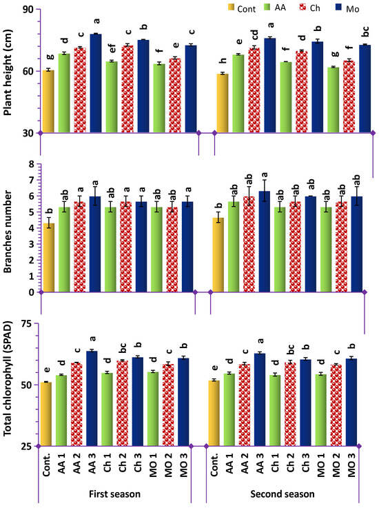 Effect of AA, Ch, and MO as a foliar spray on eggplant plant growth parameters during the 2021–2022 and 2022–2023 seasons. For each season characteristic, means followed by different letters differ by Duncan’s test (p < 0.05).