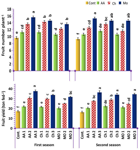 Effect of AA, Ch, and MO as a foliar spray on eggplant yield parameters during the 2021–2022 and 2022–2023 seasons. For each season characteristic, means followed by different letters differ by Duncan’s test (p < 0.05).