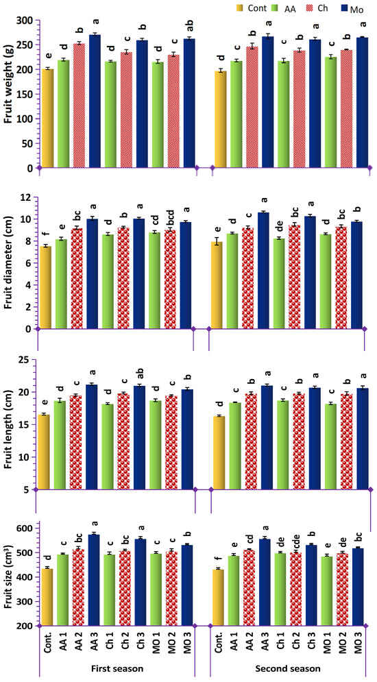 Effect of AA, Ch, and MO as a foliar spray on eggplant fruit physical parameters during the 2021–2022 and 2022–2023 seasons. For each season characteristic, means followed by different letters differ by Duncan’s test (p < 0.05).