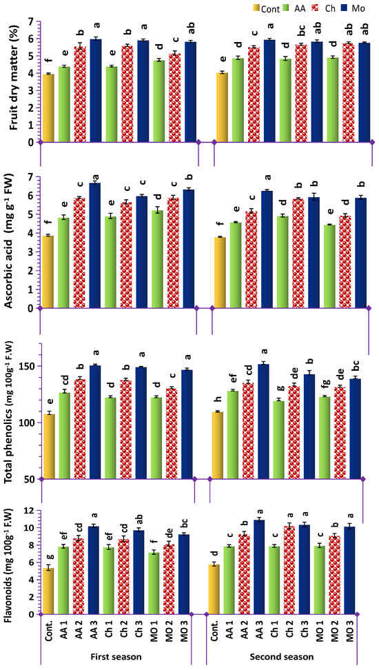 The results of the fruit’s chemical and biochemical characteristics reflected that the foliar application of AA, Ch, and MO at the concentrations of 300, 200, and 1000 mg/L, respectively, showed the highest dry matter, AA, total phenols, and total flavonoids content compared to the lower concentrations and control. These results may be due to the role of AA in photosynthetic machinery activation as a result of the stimulatory effects of the used plant growth biostimulator on the photosynthetic process [61]. Therefore, it could be expected that applied AA increased phenolic concentration as a result of the increase in carbohydrate and vitamin C synthesis, which elevates induced resistance in plants; these obtained data are in agreement with Elwan et al., 2007 [62].