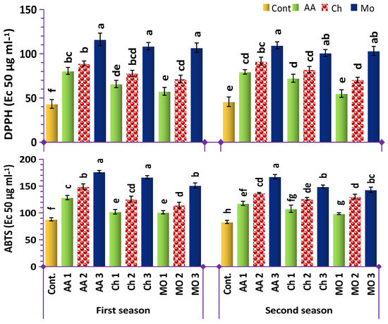 Effect of AA, Ch, and MO as a foliar spray on eggplant fruit antioxidant activities during the 2021 and 2022 seasons. For each season characteristic, means followed by different letters differ by Duncan’s test (p < 0.05).