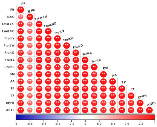 Correlation between different features and treatments in eggplant. ** is significantly different (p ≤ 0.05).